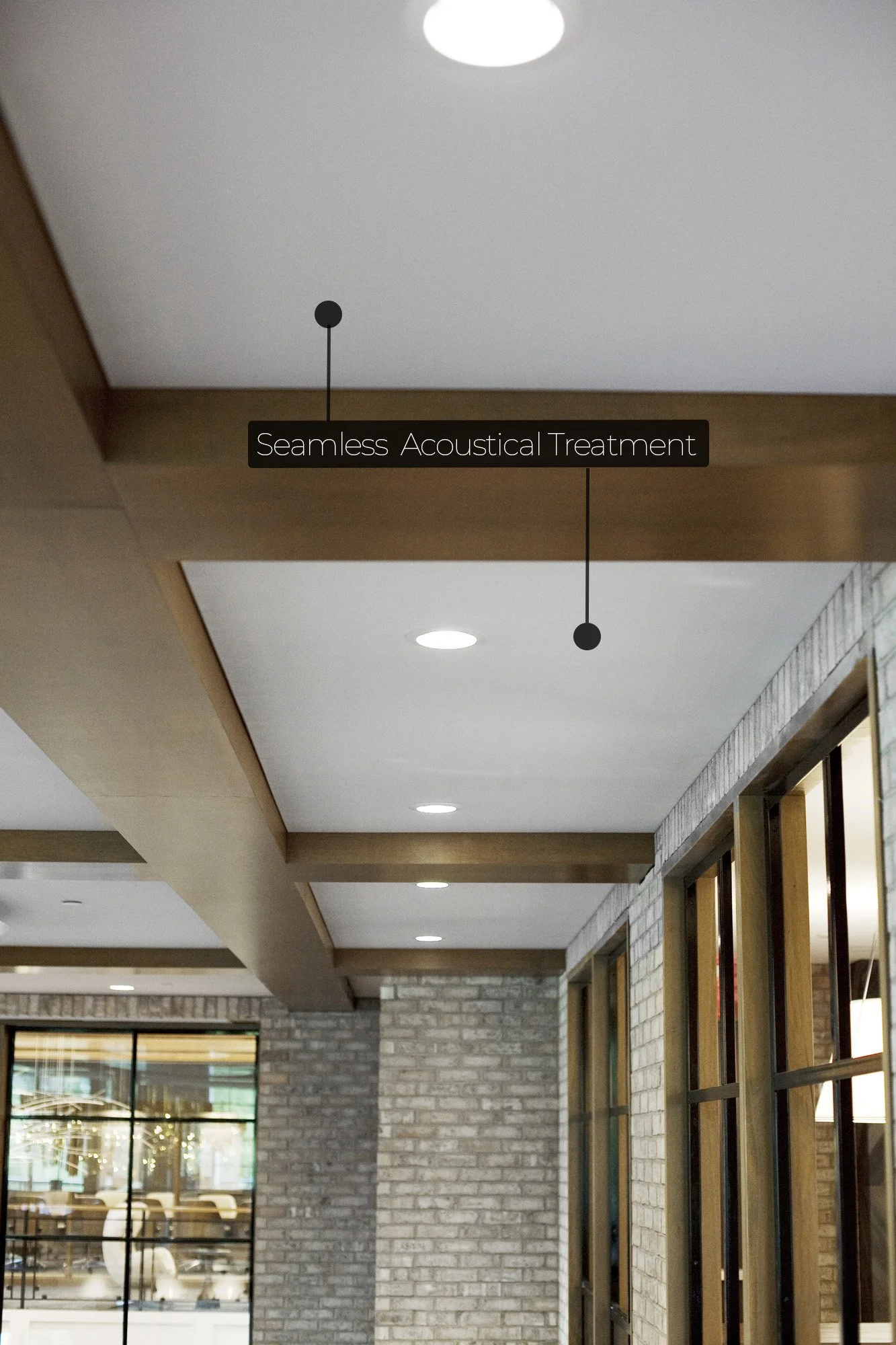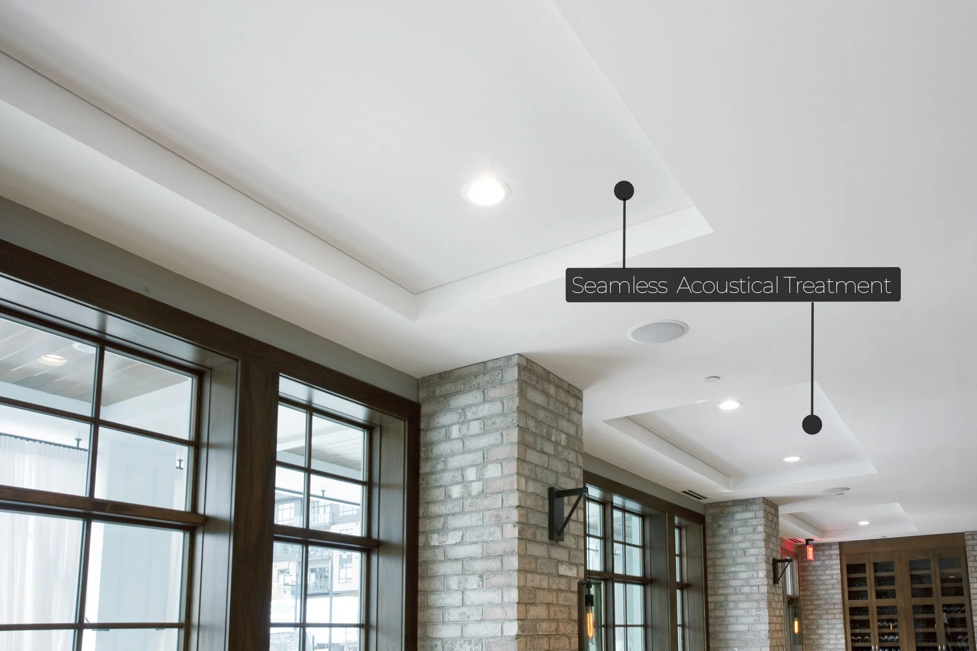 Up to 12’x12’ Seamless white fabric-finished ceiling coffers.