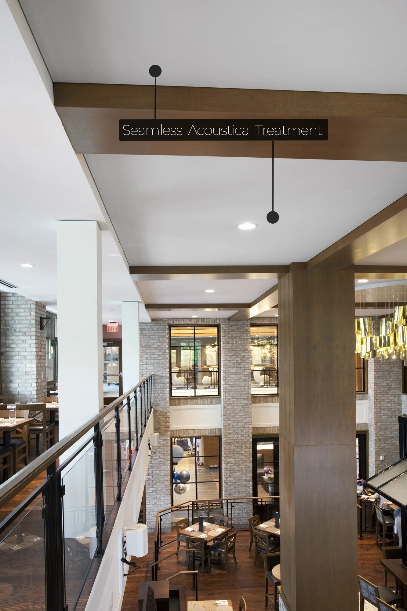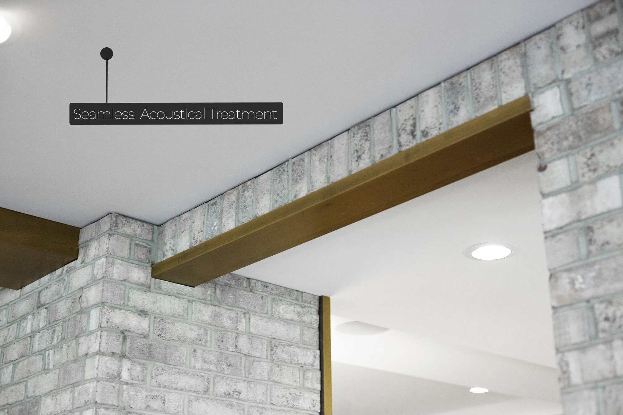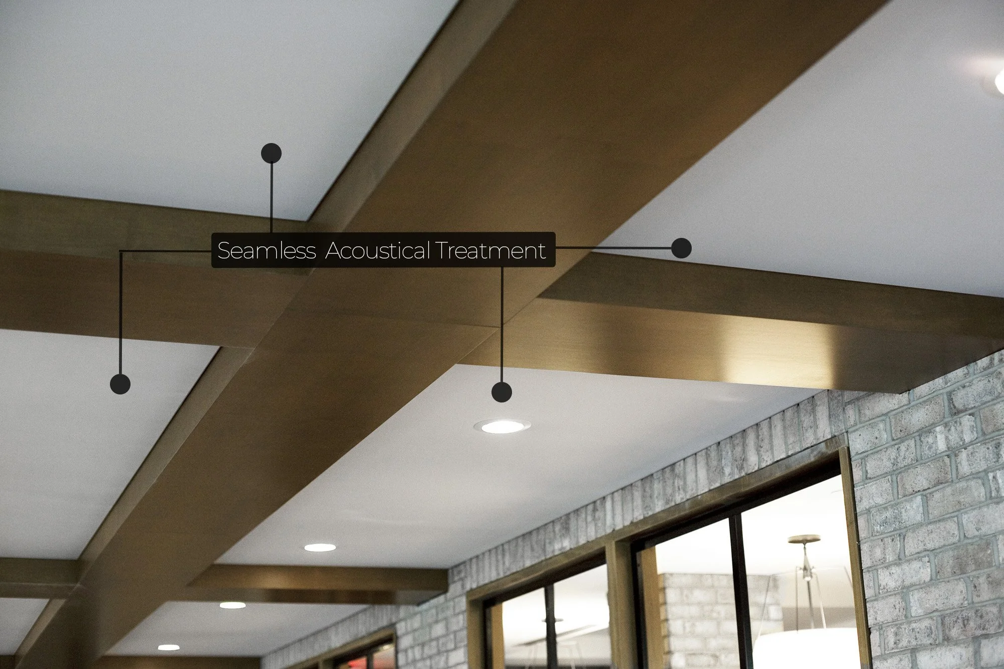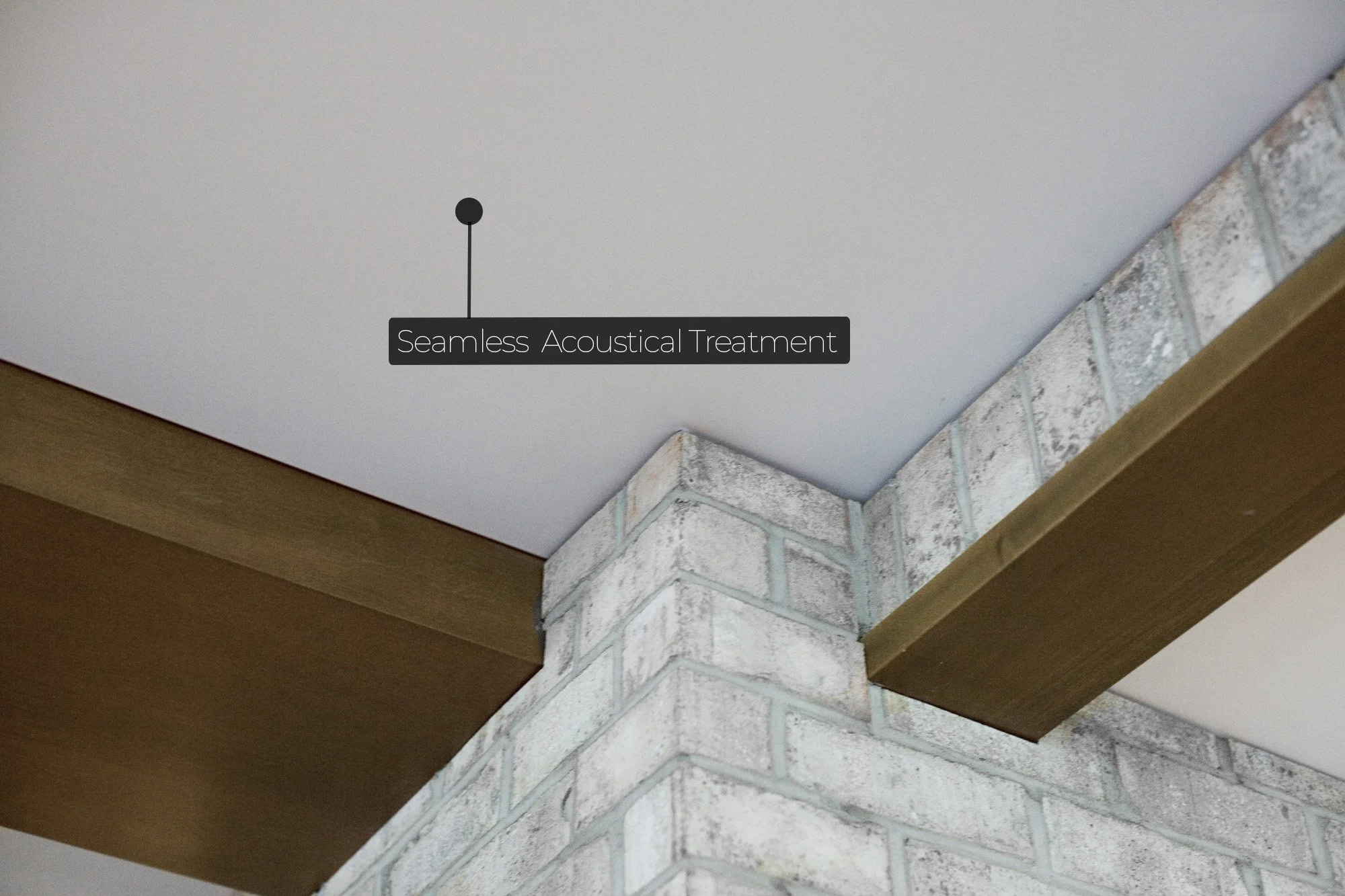 Stretched, seamless acoustical-fabric over sound absorption-insulation.