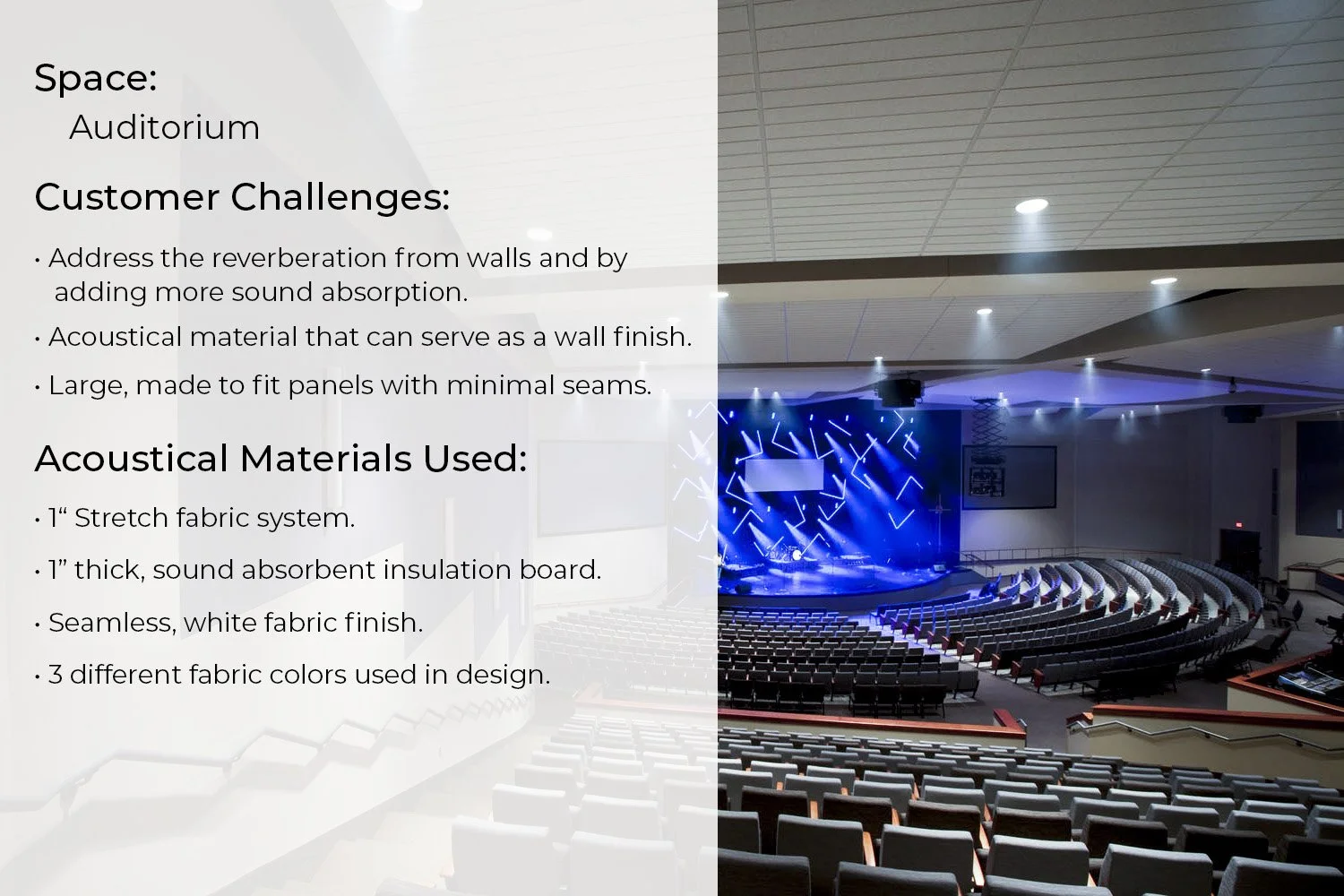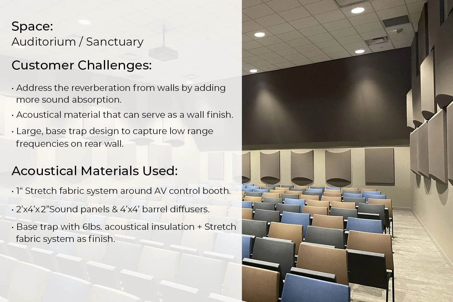 “We are so happy with sound quality of our new auditorium. The look and feel of the space turned out amazing!”